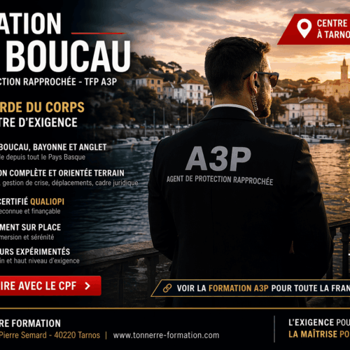 Cette page est spécifiquement pensée pour répondre aux recherches liées à la formation A3P à Boucau. De nombreux candidats cherchent aujourd’hui une solution de proximité pour accéder au TFP A3P sans devoir s’éloigner inutilement. Tonnerre Formation répond à cette attente avec un centre situé tout près de Boucau, dans un secteur facilement accessible depuis Bayonne, Anglet, Biarritz et l’ensemble du Pays Basque.